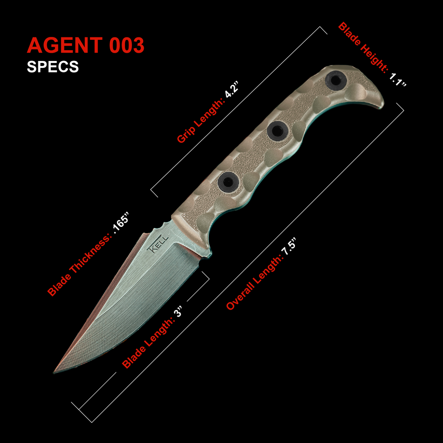 The AGENT 003 blends our proven Nightstalker blade performance with our ergonomic, quick-deploying agent grip to create a compact, reliable fixed blade for everyday carry. Its NiB-coated drop point blade delivers strong piercing power and smooth slicing, while the Grenade Texture grip, jimping ramp, and low-profile pommel ensure a confident grip under pressure. Paired with our ultra low-profile sheath, the AGENT 003 stays discreet whether carried on the belt, in the waistband, or in a pocket, making it a dependable, low-profile defensive tool you can trust every day.
