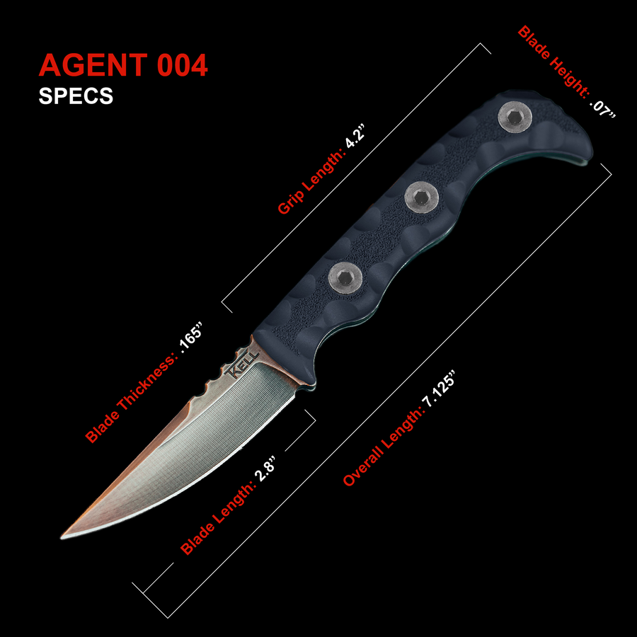 The AGENT 004 is a purpose-driven Tactical Pukko fixed blade designed for deep concealment, fast deployment, and dependable everyday performance. Its compact dimensions, reinforced swedge, and stout 0.165 steel create a knife that excels at piercing while remaining slim enough for effortless EDC. The ergonomic grip, Grenade Texture, and low-profile pommel ensure total control under pressure, while the ultra low-profile sheath system allows the AGENT 004 to disappear under even the thinnest clothing. Whether carried on the belt, in the waistband, or in a pocket, the AGENT 004 delivers strength, discretion, and reliability in any environment.
