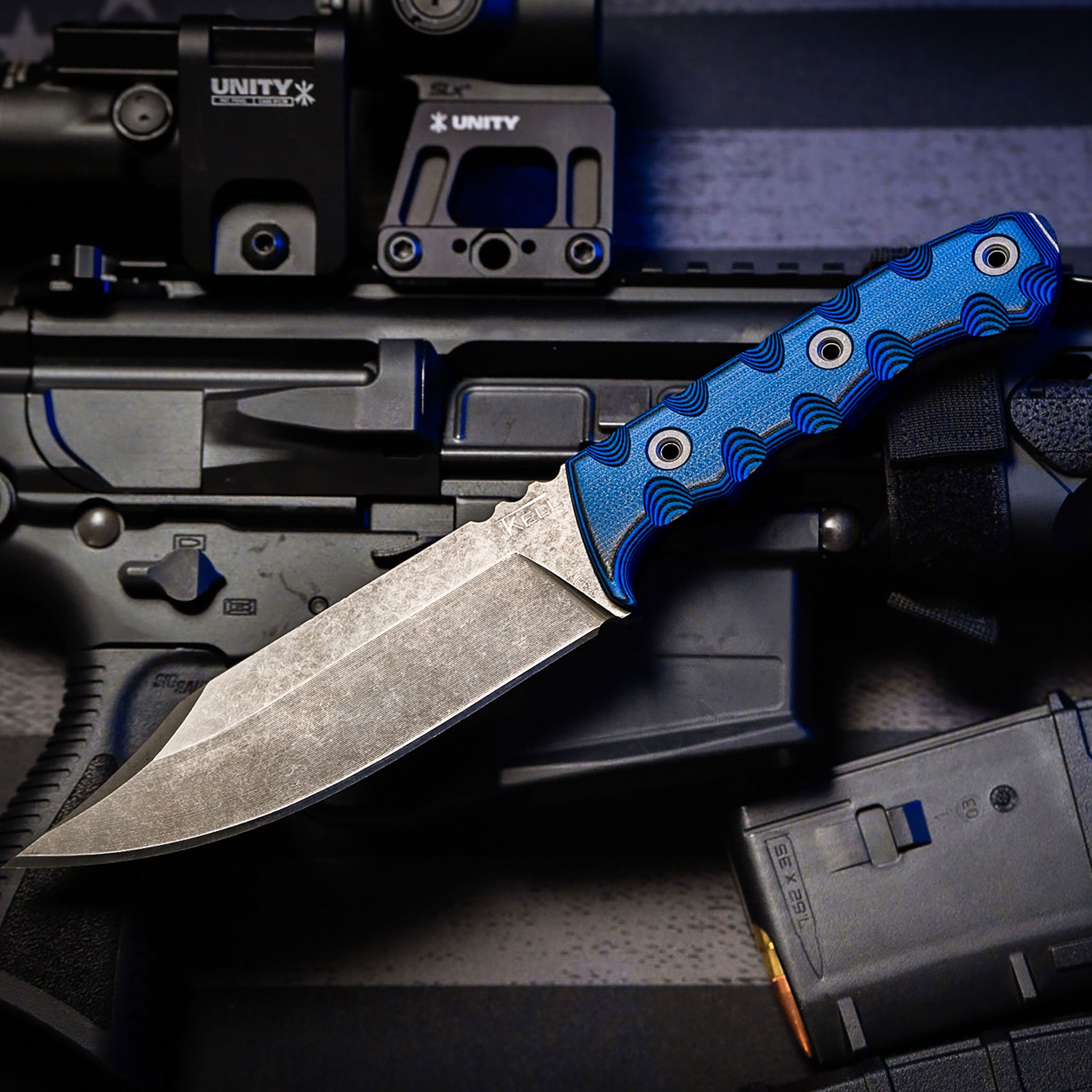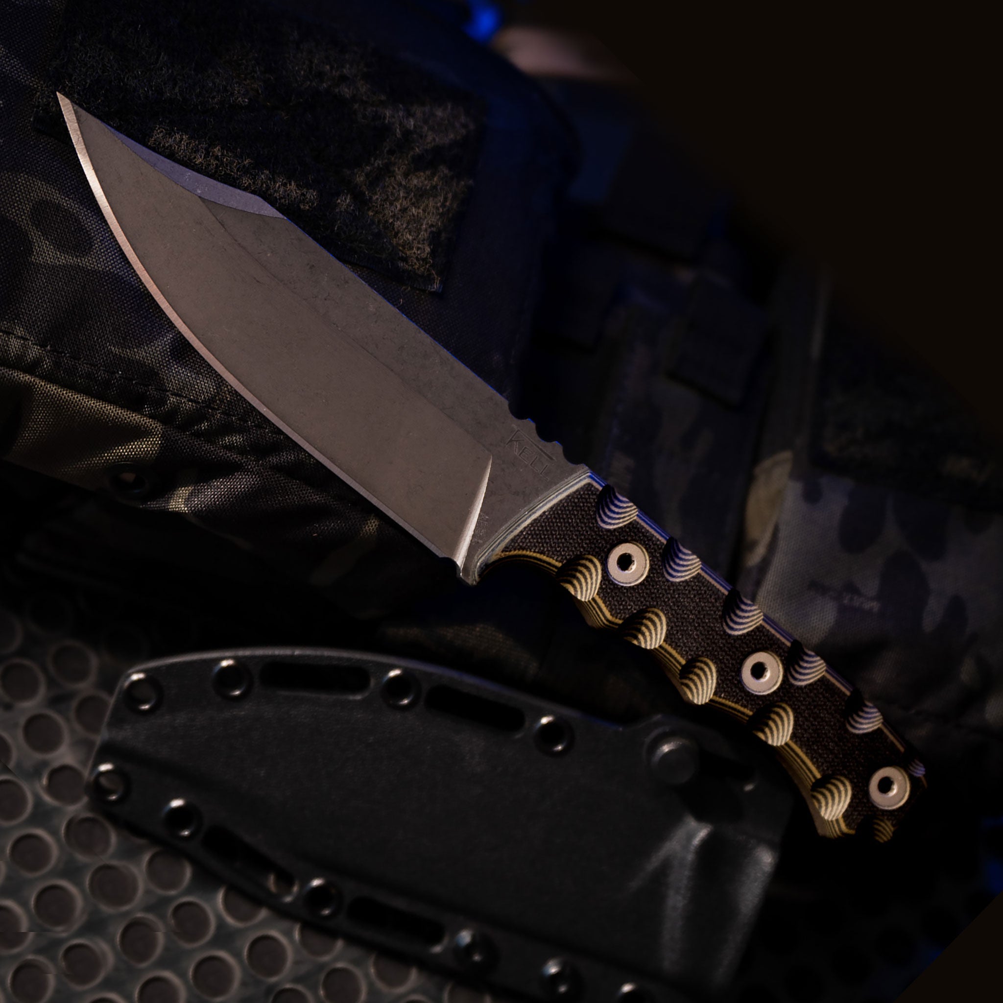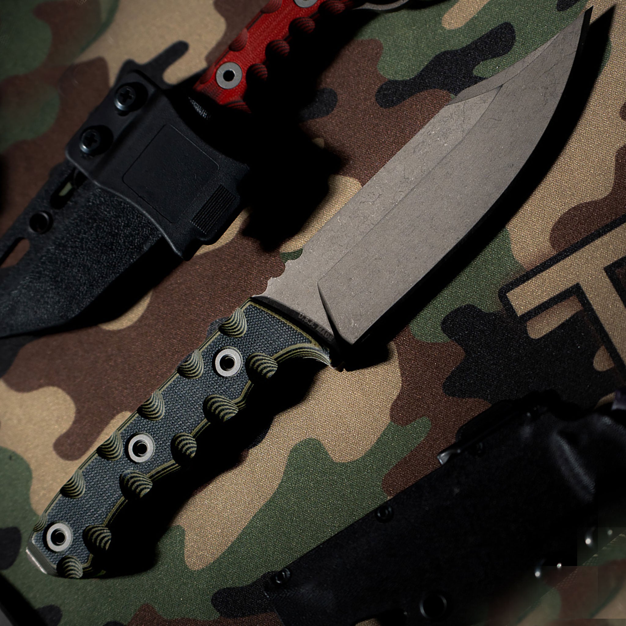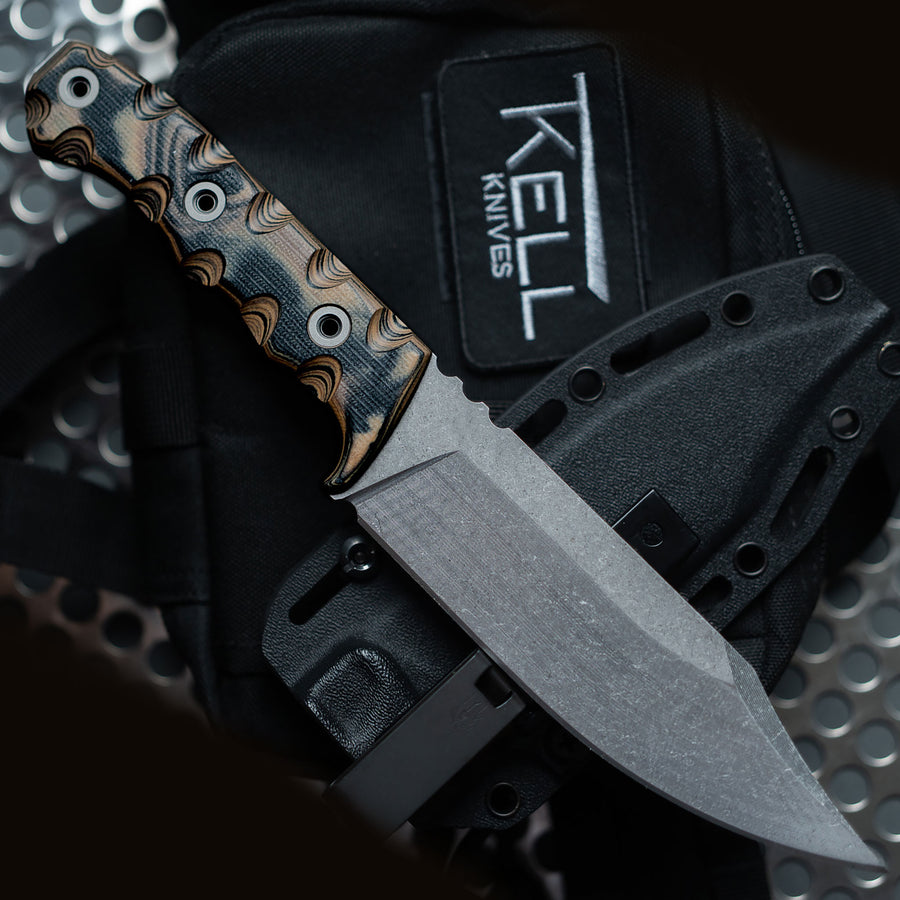 The SERE line of blades started with the now incredibly popular Mercenary. The Mercenary was created to fill the need for a fast, well balanced, full handled, and capable combat blade. Like the need that drove the design of the Mercenary. We recognized a need for a combat blade, but this time with a bend toward survival, the ultimate field knife built for exactly what the rigors of SERE are. From that need was born the The FMF. We started with a clip point bowie style blade and used our famed diamond shaped tip for incredible strength with insane piercing ability. The balance points on all T.Kell blades have been thought out and perfected and the FMF does not disappoint. For a big blade it feels super fast and nimble while retaining the strength of .165 thick blade. Survival scenarios may require you to chop, slice, stab, prep game, start fires, defend your fort, or fight your way to freedom. The FMF was designed to be your sidekick when SERE is your mission.